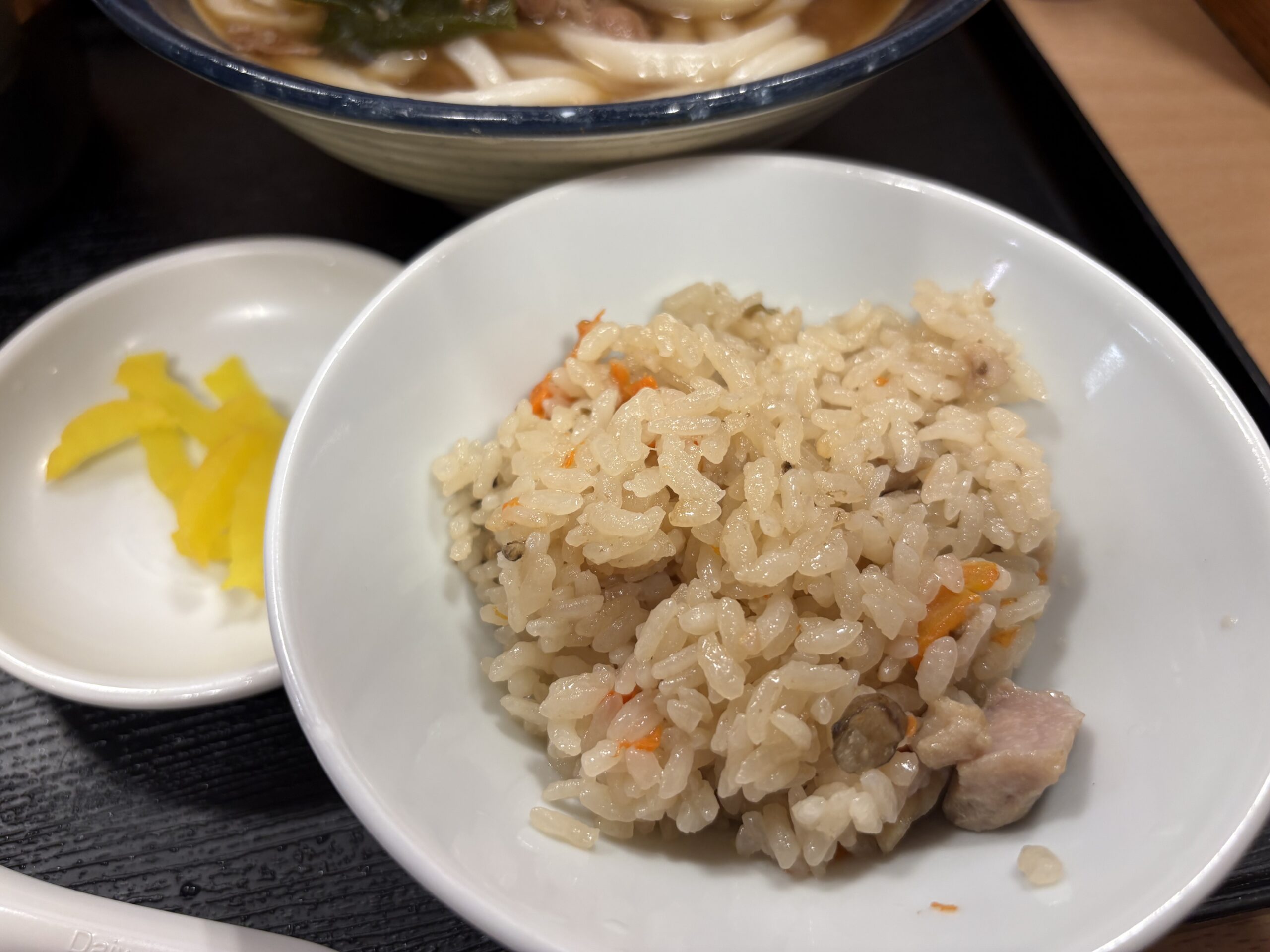 これも牧のうどんの名物で出汁が効いていてかしわご飯だけでもおいしく、そのままかしわご飯のお店を出せそうなくらいのクオリティの高さです。